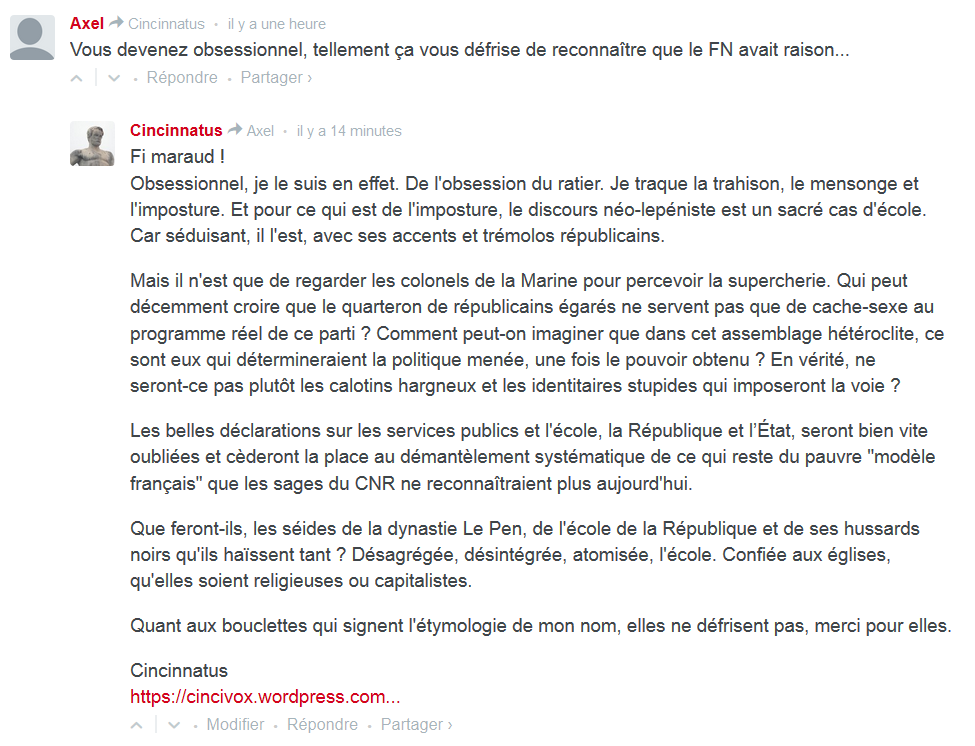 PS : le 25 avril 2015, dans la partie commentaire d’un article de Marianne, j’ai été interpelé sur ces sujets. Bien qu’il ne faille en général pas nourrir les trolls (non il ne faut pas, c’est pas bien !), je me suis senti obligé de répondre :