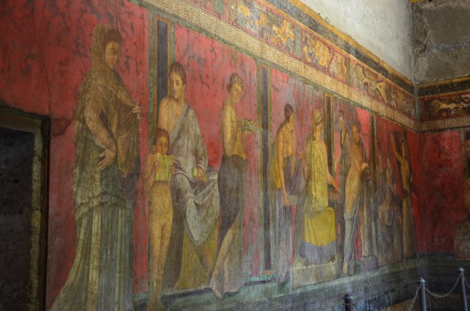 Entre deux groupes, une famille de Français arrive dans la villa des Mystères, devant l’une des plus belles fresques au monde : la mère admire pendant au moins deux bonnes minutes (presque un record), le père s’impatiente et le fait savoir bruyamment en tapant du pied à l’entrée sur une mosaïque de deux mille ans, la fille adolescente s’exclame : « c’est dingue, ils étaient vachement forts en peinture pour que ça ait duré si longtemps ». Pourquoi ne pas profiter de cette exclamation naïve mais sincère pour encourager sa curiosité ? Non : il faut suivre le plan sur lequel les « choses à voir » sont marquées et numérotées, les relier dans l’ordre comme ces jeux pour enfants où les points dessinent à la fin une figure, se dépêcher de tout voir pour remplir le programme… sans avoir rien vu au final. Alors exeunt omnes, tirés par le père et poussés par le groupe d’Allemands qui entre déjà, flashes crépitants.
